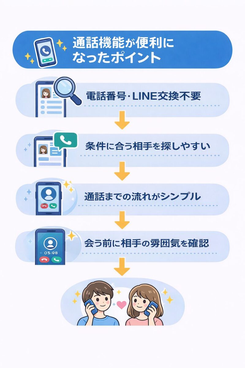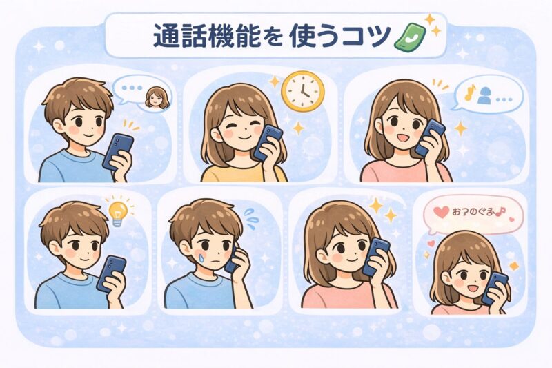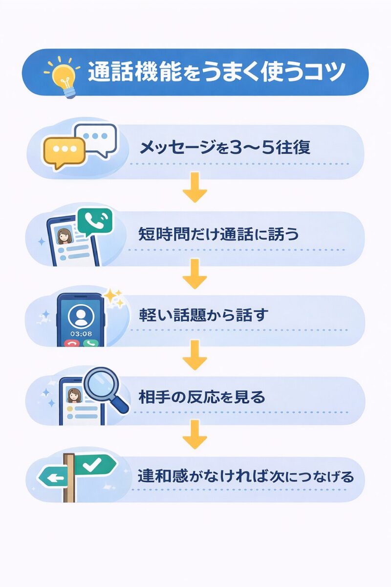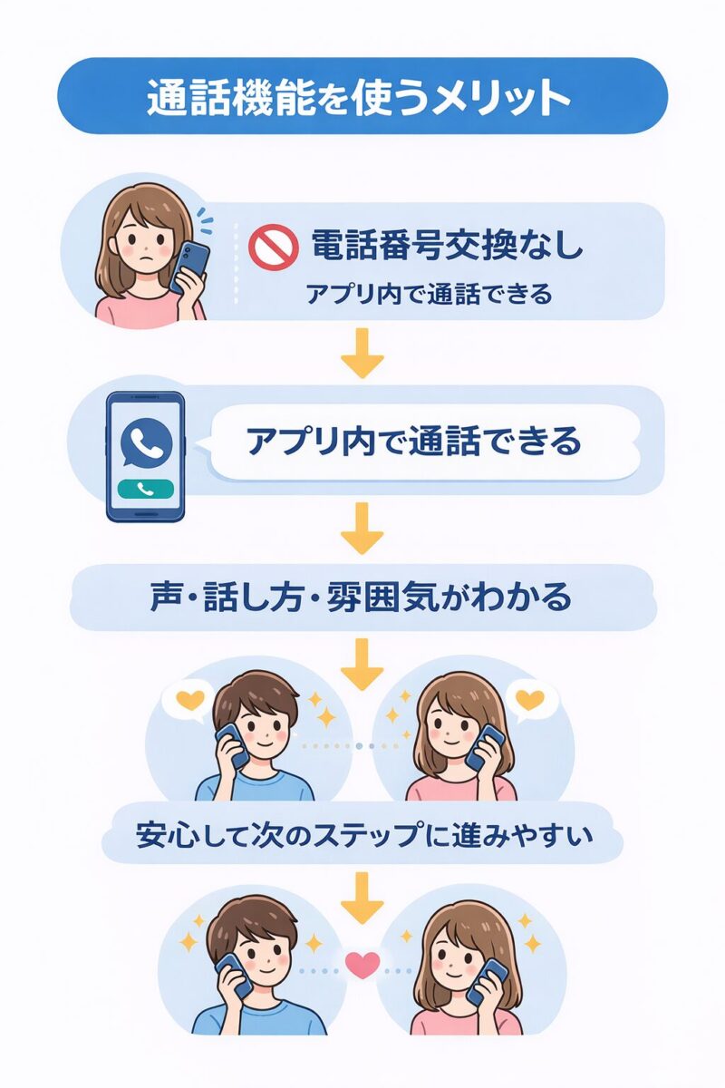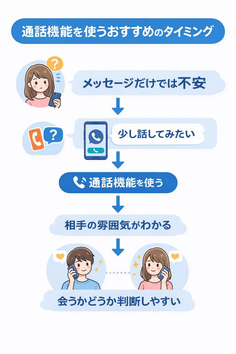 通話機能は、仲良くなるためだけでなく、安心してやり取りを進めるための確認にも役立ちます。