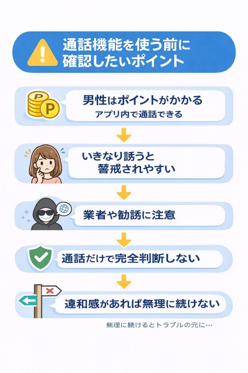 一方で、男性はポイントがかかることや、いきなり通話に誘うと警戒されやすいことなど、気をつけたい点もあります。