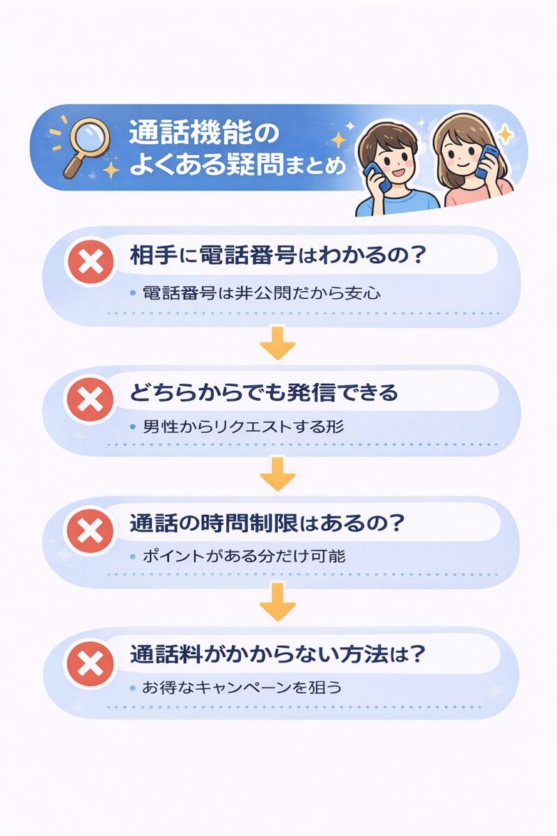 ※「安全に使いたい」「身バレが不安」という人は、通話機能だけでなく、プロフィール・写真・通知・課金明細まで含めた対策を先に確認しておくと安心です。