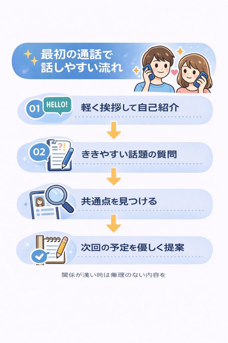 特に女性側は慎重な人も多いため、まずはメッセージで少しやり取りしてから通話に誘う流れのほうが自然です。