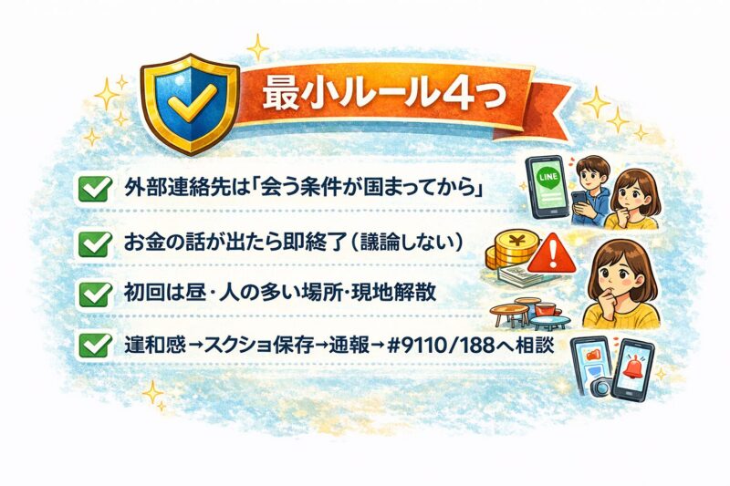 - 違和感が出たらスクショ→通報→必要なら188等へ相談