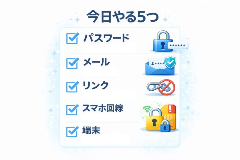 まずは 「パスワード → メール → スマホ回線」 の順で守りを固めれば大丈夫です。落ち着いて一つずつ進めていきましょう。