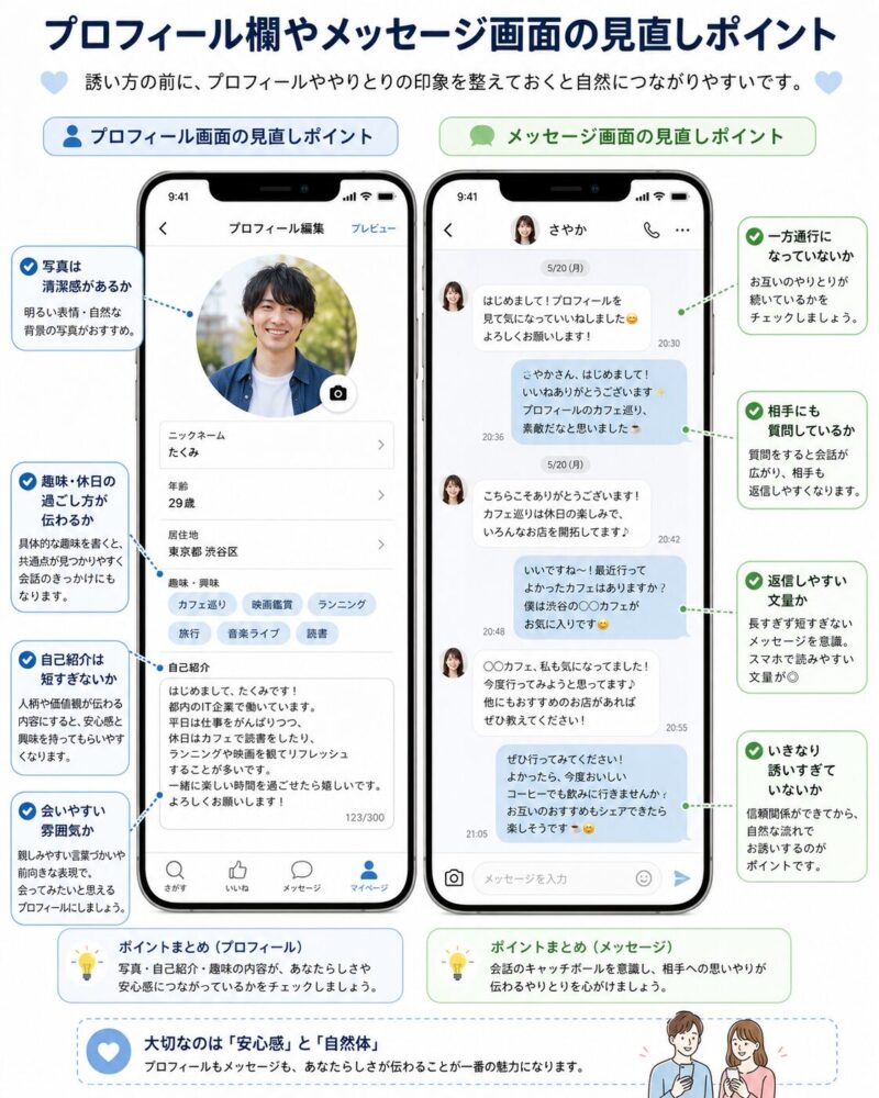 ここが不安なままだと、誘い方だけ整えても通りにくいです。