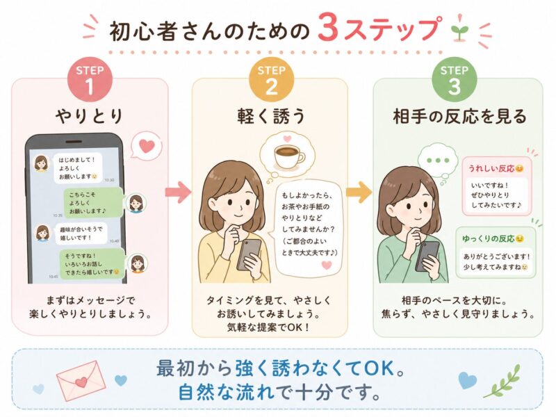 ※やりとりの進み方には個人差があります。焦って誘うより、相手の反応を見ながら進めるほうが安心です。仕様や使い方は変わることもあるため、必要に応じて最新情報も確認してください。