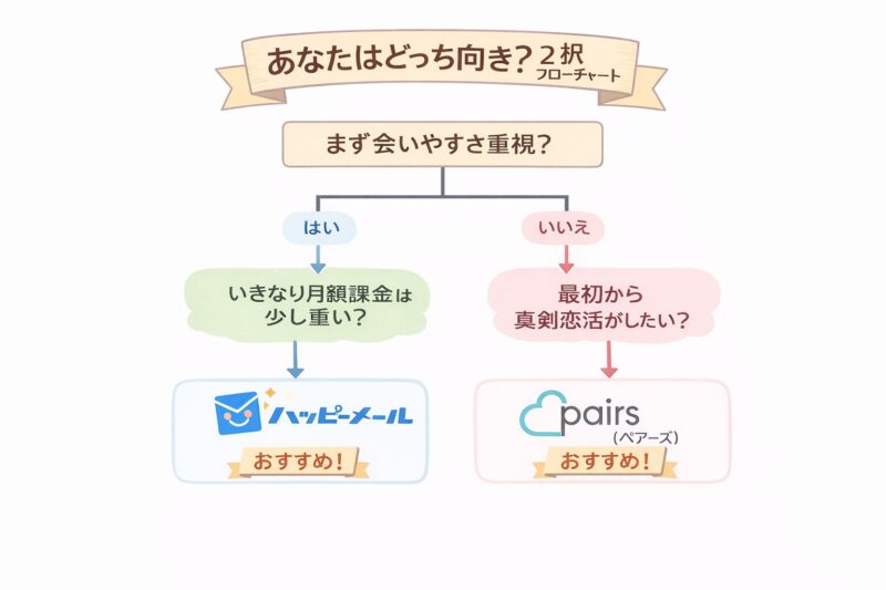 短く試しやすいのはハッピーメール、落ち着いて続けやすいのはPairsです。