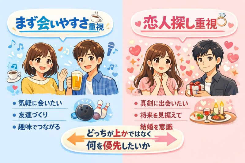 迷ったら、まずは「恋人探しを最優先するか」「まず出会いの機会を増やしたいか」で考えると、かなり決めやすくなります。