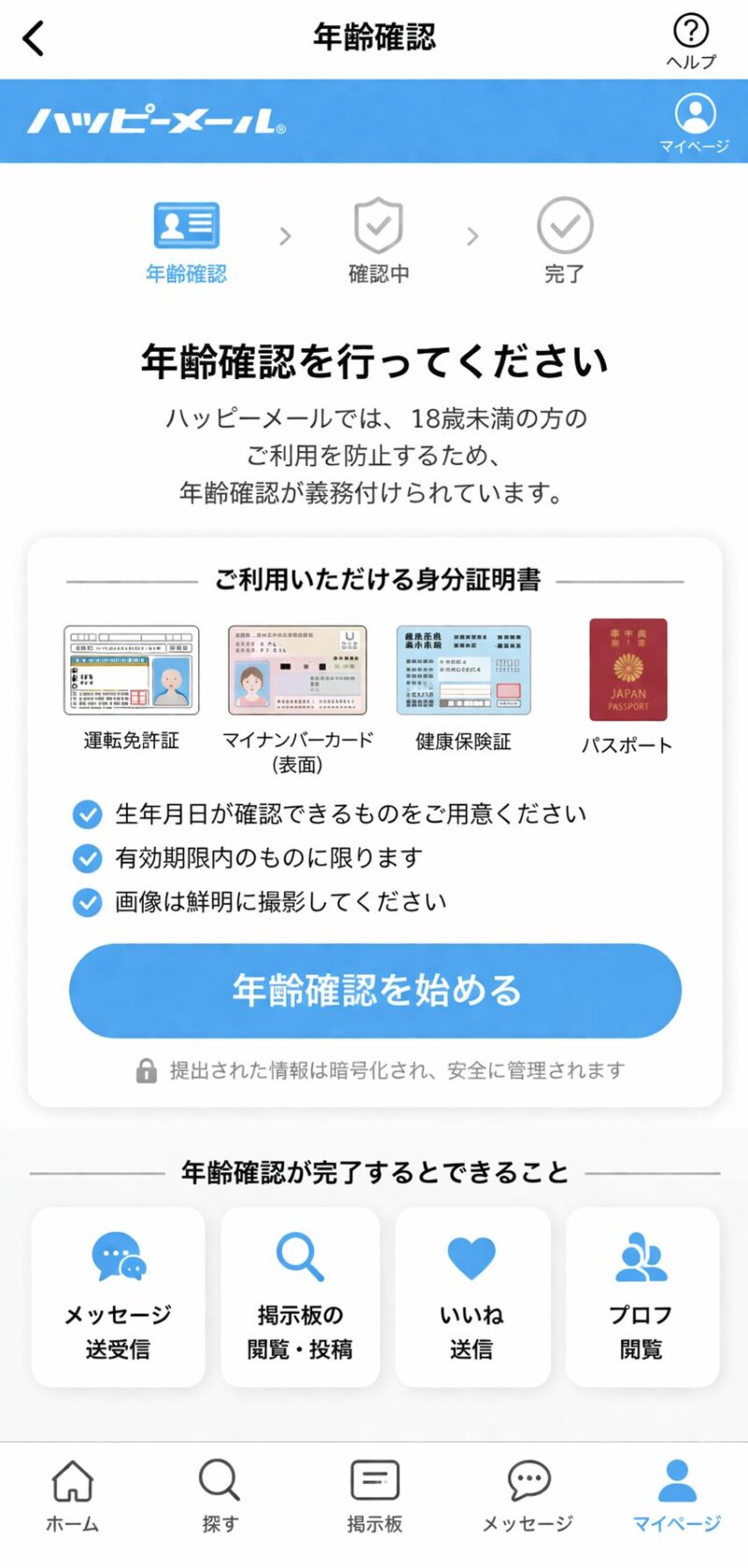 登録後は 認証(SMS/音声)→年齢確認→プロフィール設定 まで進めるとスムーズです。