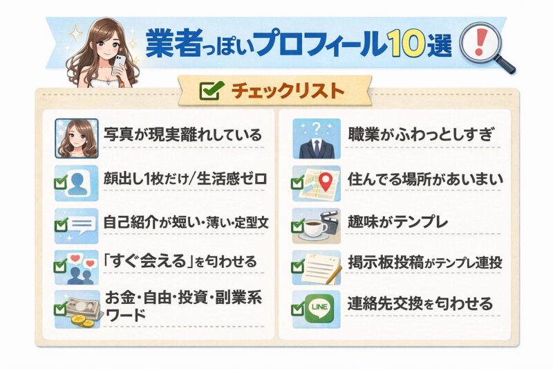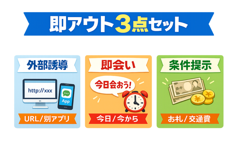 いわゆる「サクラ」という言葉で語られることもありますが、ユーザーが実際に遭遇しやすいのは外部誘導などの“業者”パターンです。まずは「外部誘導」「条件」「店誘導」だけ切れば、事故率は一気に下がります。
