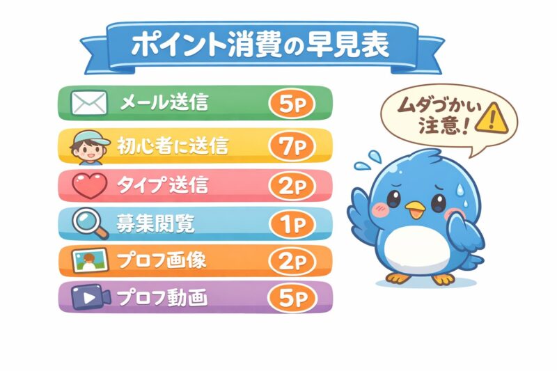 つまり、反応が薄い相手に何通も送ったり、画像や動画を深く見すぎたりすると、思っている以上にポイントが減っていきます。「月額じゃないから安そう」と感じても、使い方が雑だと結果的に割高になることがあります。