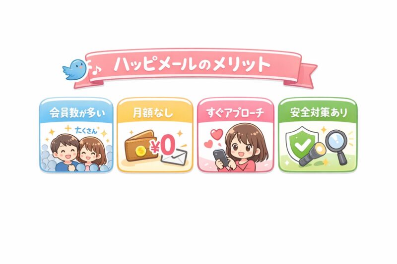 ハッピーメールは、会員数の多さと月額制ではない始めやすさが大きな魅力です。反対に、ポイント課金の管理と相手の見極めは必須です。