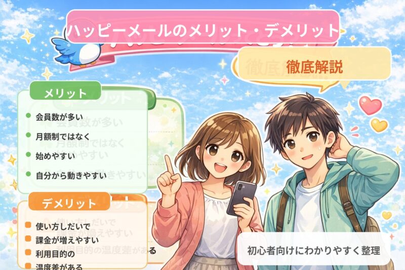 ハッピーメールは「誰にでも無条件でおすすめ」というより、仕組みを理解して使える人にはかなり相性がいいタイプのサービスです。特に、月額制より「必要な分だけ使いたい」と考える人には、ハマりやすいです。