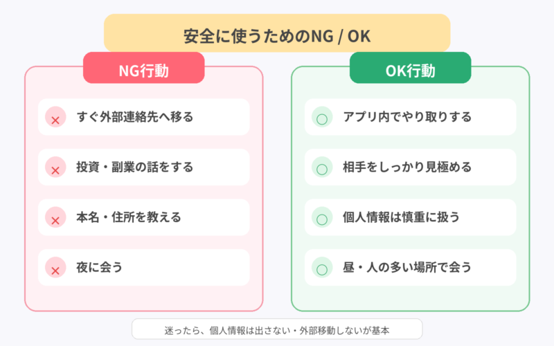 ここは「ハッピーメールが危ない」というより、マッチング系全体で共通して気をつけるべき部分です。サービス側の対策があっても、最後は自分の判断が必要になります。